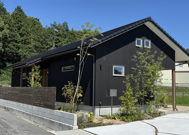 焼杉板の外壁がもつ重厚さに、やわらかな植栽と曲線のアプローチで軽やかさを添えました。玄関までの細長いアプローチはくねくねと曲げ、視線をそらすように植栽を配置。自然の中を歩くような体験をデザインしています。広々とした土間には、直線ではなくゆるやかなカーブを。割り溝もあえてガタつかせ、そこに種を蒔くことで、やがて緑が割れ目を覆い、風景の一部となっていきます。