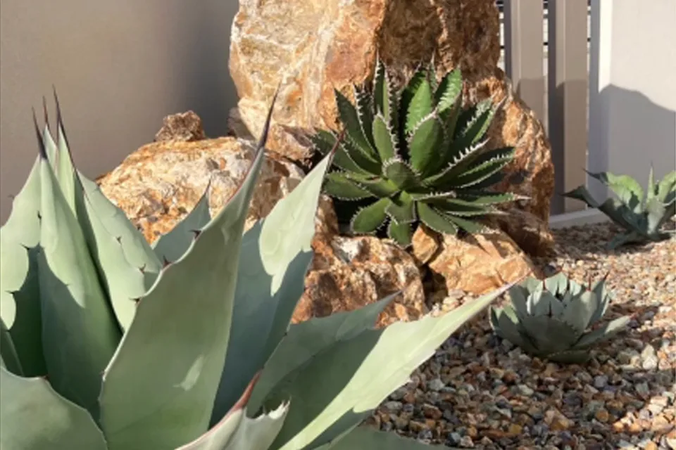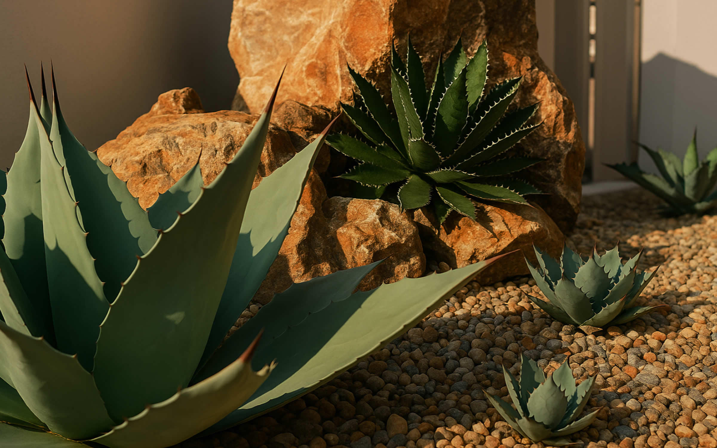 砂利や岩、乾燥に強い植物(例:ユッカ、アガベ、サボテンなど)を使った、水やりが少なくて済む庭。スタイリッシュで個性的な雰囲気が魅力です。モダン住宅や店舗の外構とも相性がよく、省メンテナンスで美観を保ちたい方にぴったりの庭スタイルです。